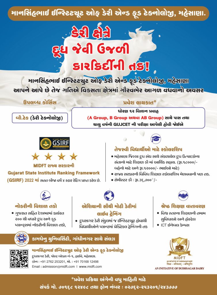 - Admission 2023-24 open for B. Tech. Dairy Technology Course. Please visit Kamdhenu University Website for Online Application: http://kamdhenuuniversity.net/. Please note that the last date for application: 15-06-2023.