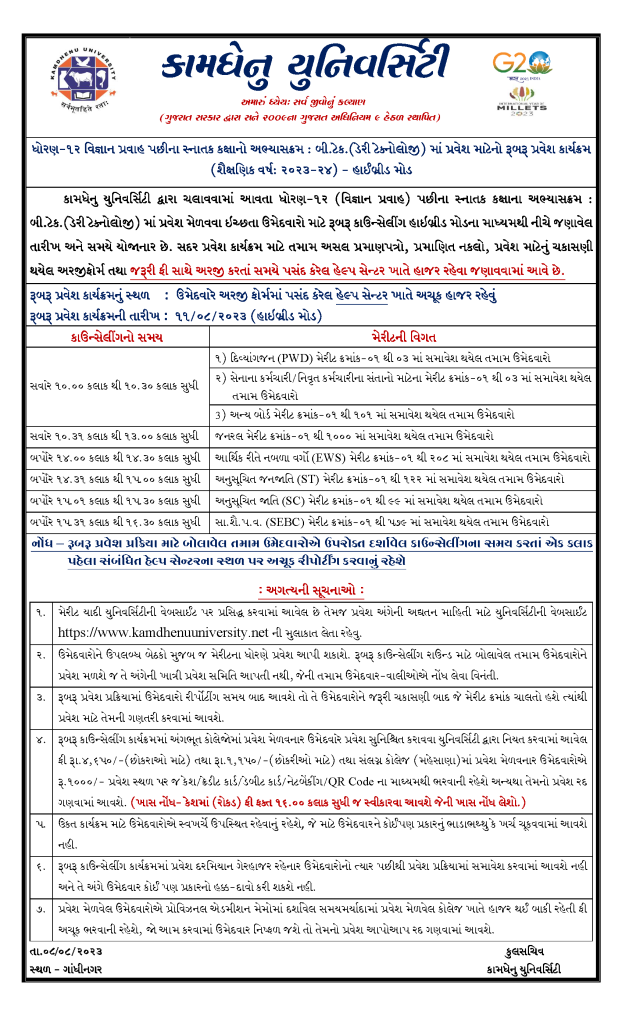 ૨૦૨૩-૨૪: રૂબરૂ પ્રવેશ કાર્યક્રમ બી.ટેક. (ડેરી ટેક્નોલોજી), તા: ૧૧-૦૮-૨૦૨૩ August 8, 2023August 9, 2023 admin